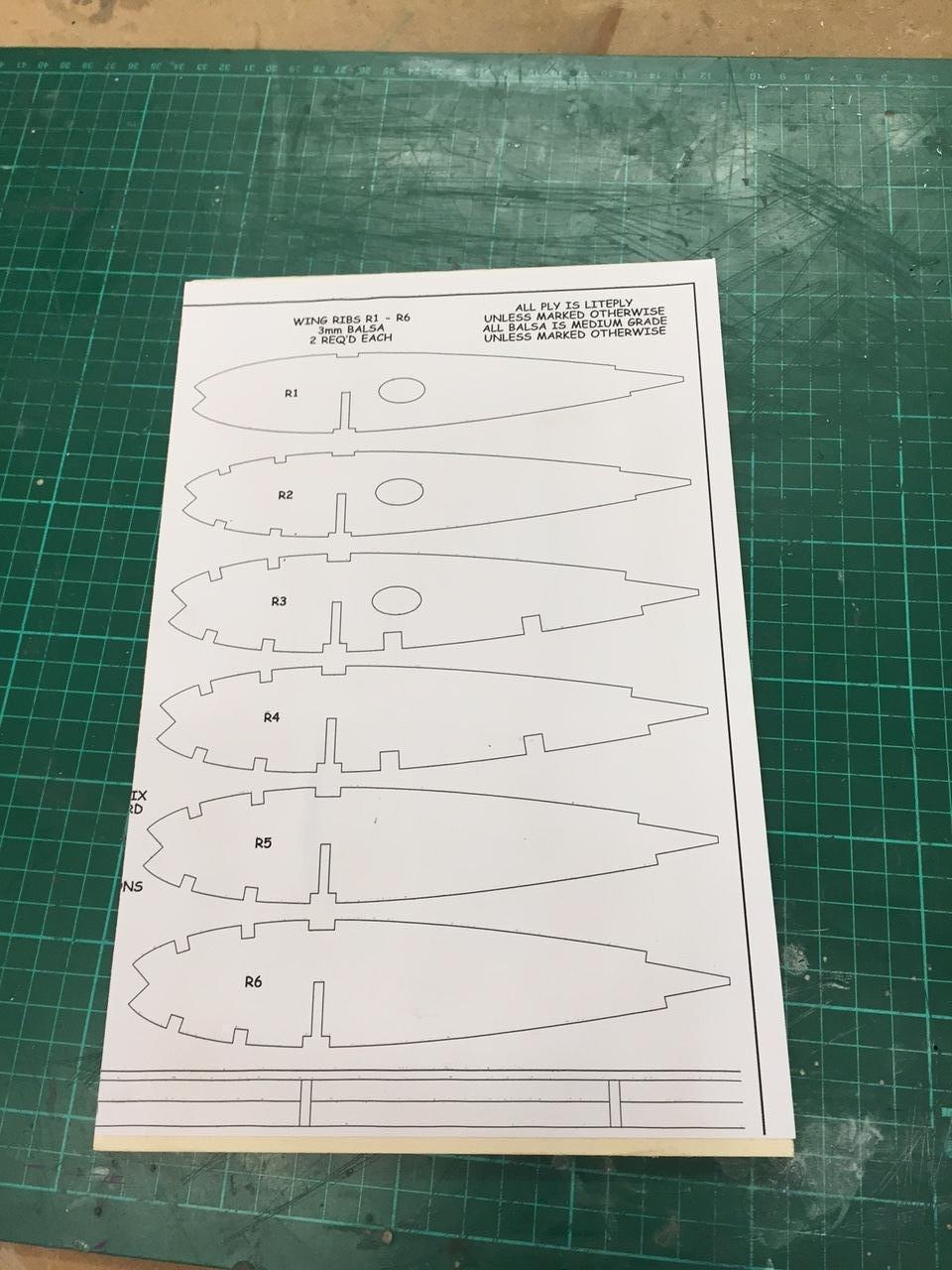 Moved on to the main wing. Decided to make wing ribs out of 3mm liteply. Laminated two sheets together with pattern laminated on top...